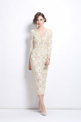 - Fitted long sleeves and a deep V-neckline offer a flattering contrast between modesty and allure