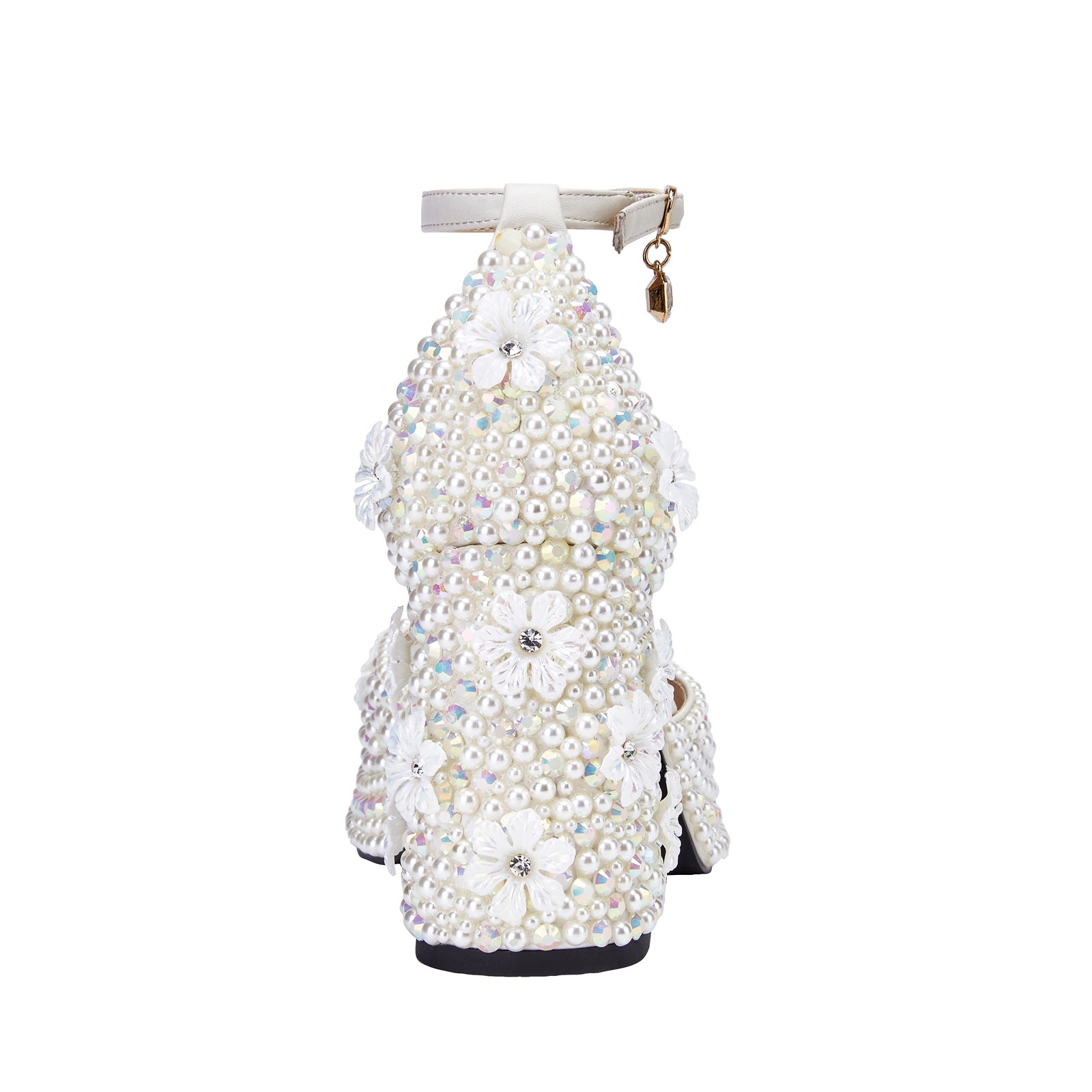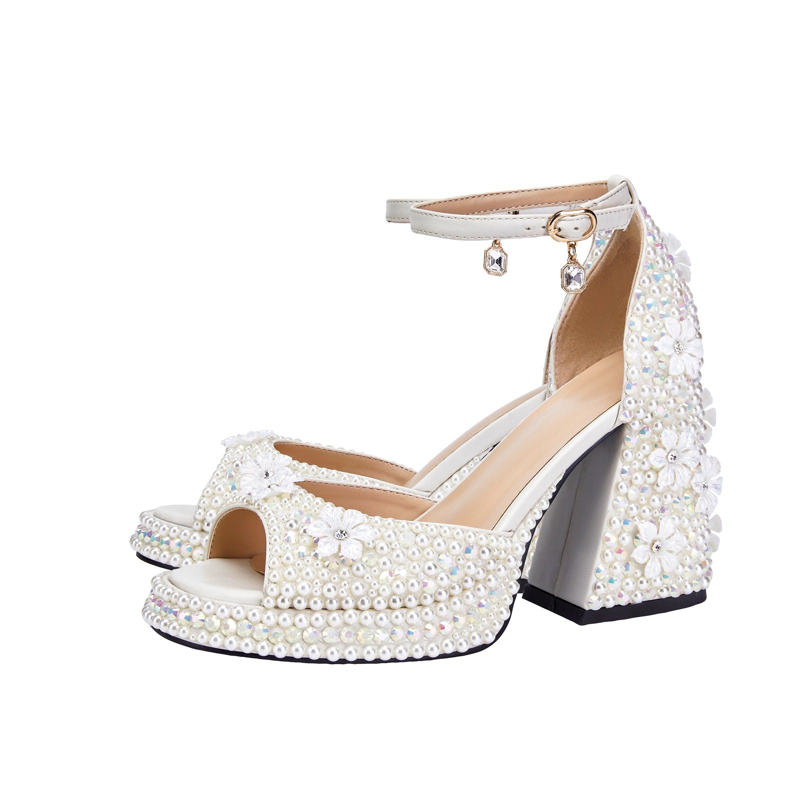 These sandals are your glass slippers reimagined - princess-approved and ready to steal hearts. The White Pearl Encrusted Flower Chunky Sandals is a dreamy blend of romance and regal charm. Adorned with lustrous pearls, delicate floral appliqués, and shimmering crystal accents, these sandals are made to make every moment feel like a walk down the aisle even if you're just headed to brunch.