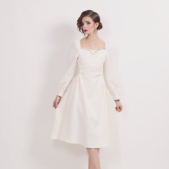 Lean into its regal romance with pearl earrings, a bejeweled clutch, and vintage-inspired pumps. For a modern twist, pair with sleek minimalist heels and a bold lip for a striking contrast. This is the ultimate women's puff sleeve middi dress to wear when you want to feel effortlessly feminine and unmistakably memorable. Get the White Sweetheart Embellished Puff Sleeve Midi Dress from DZA by 0cm.