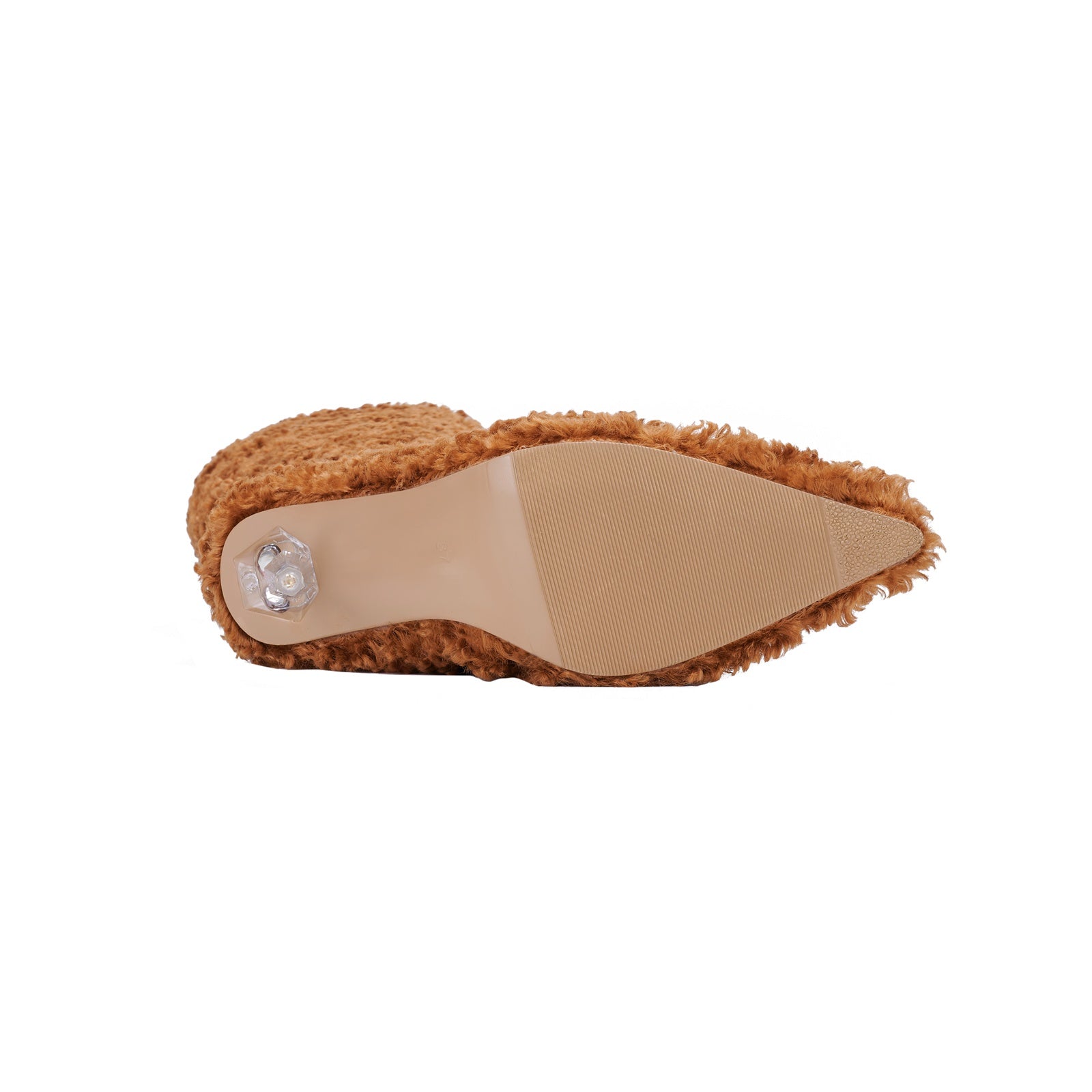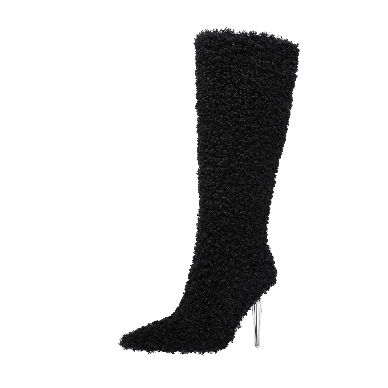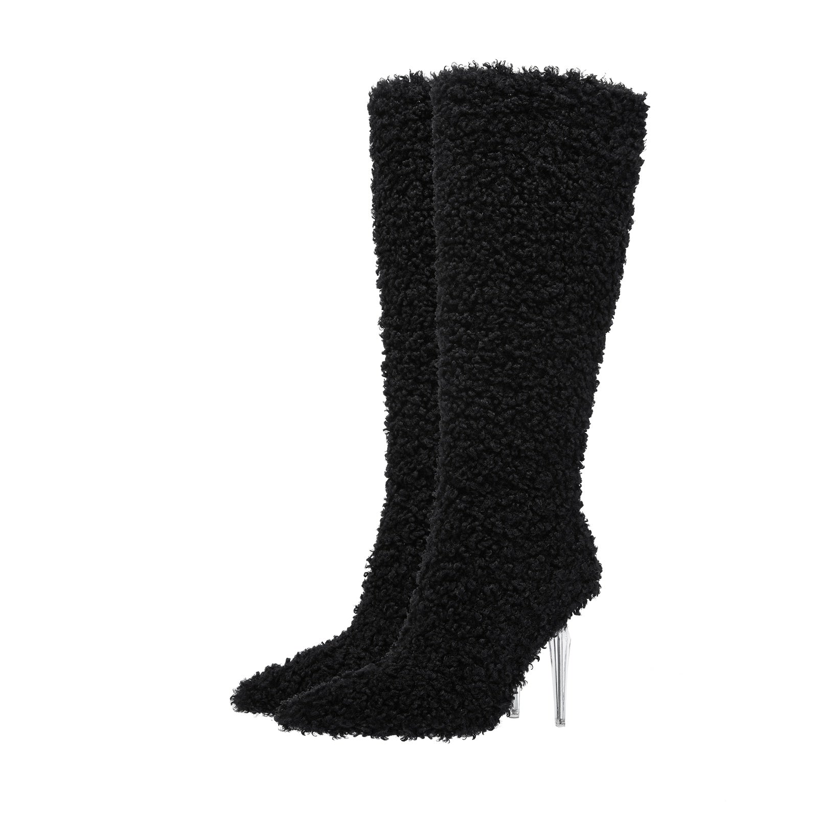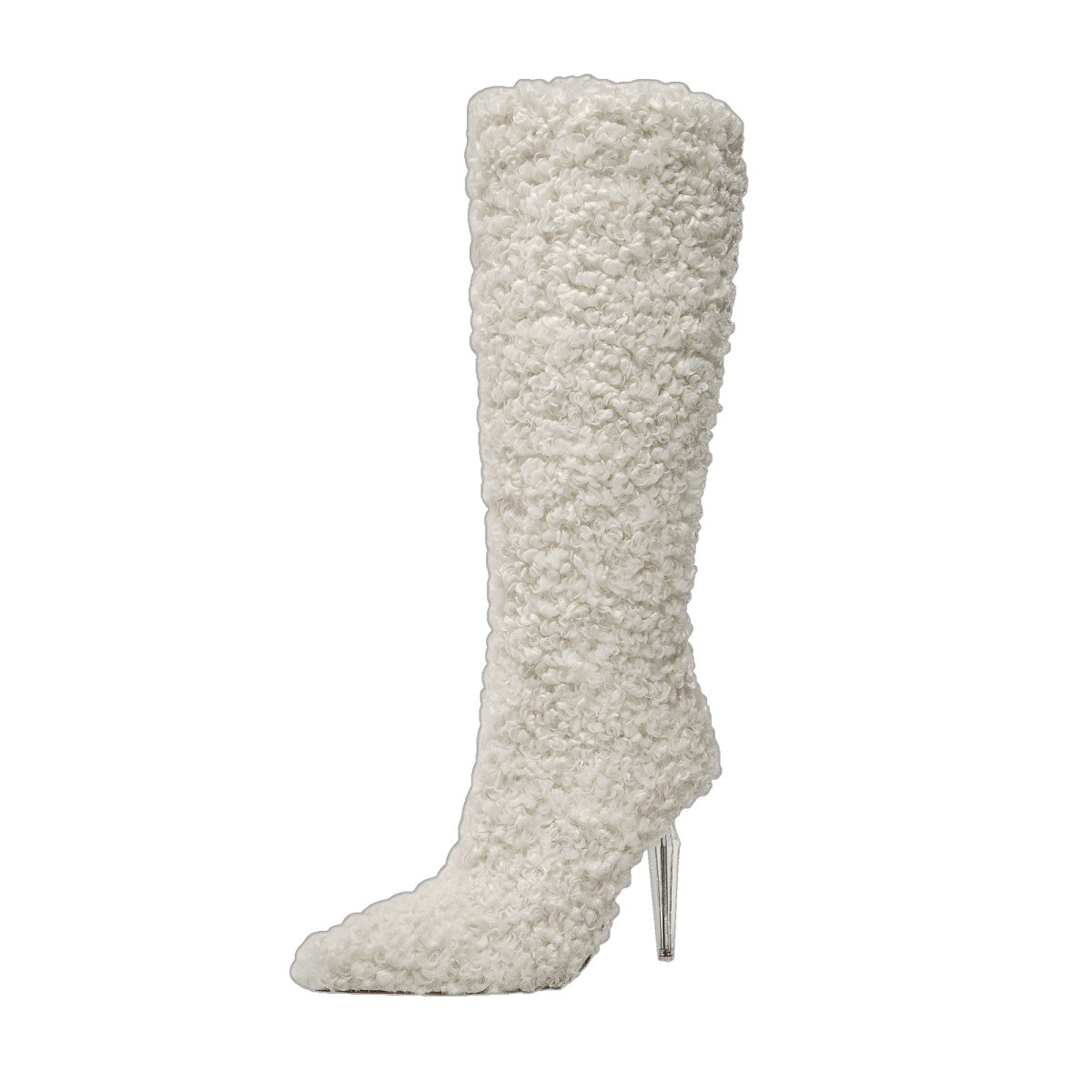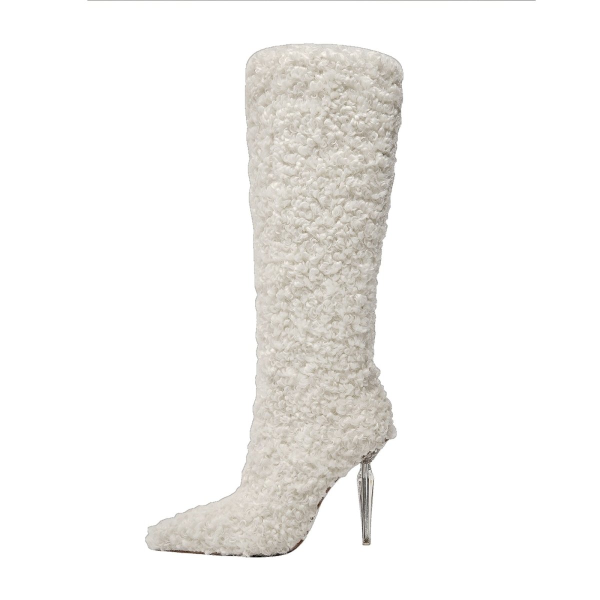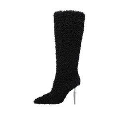 Cozy just got a couture upgrade with the Wooly Pointed Toe Knee High Boots, a tactile statement piece that wraps warmth, texture, and modern elegance into one unforgettable silhouette. Finished with a crystal-clear stiletto heel, these boots strike the perfect balance between snuggly softness and runway shine.