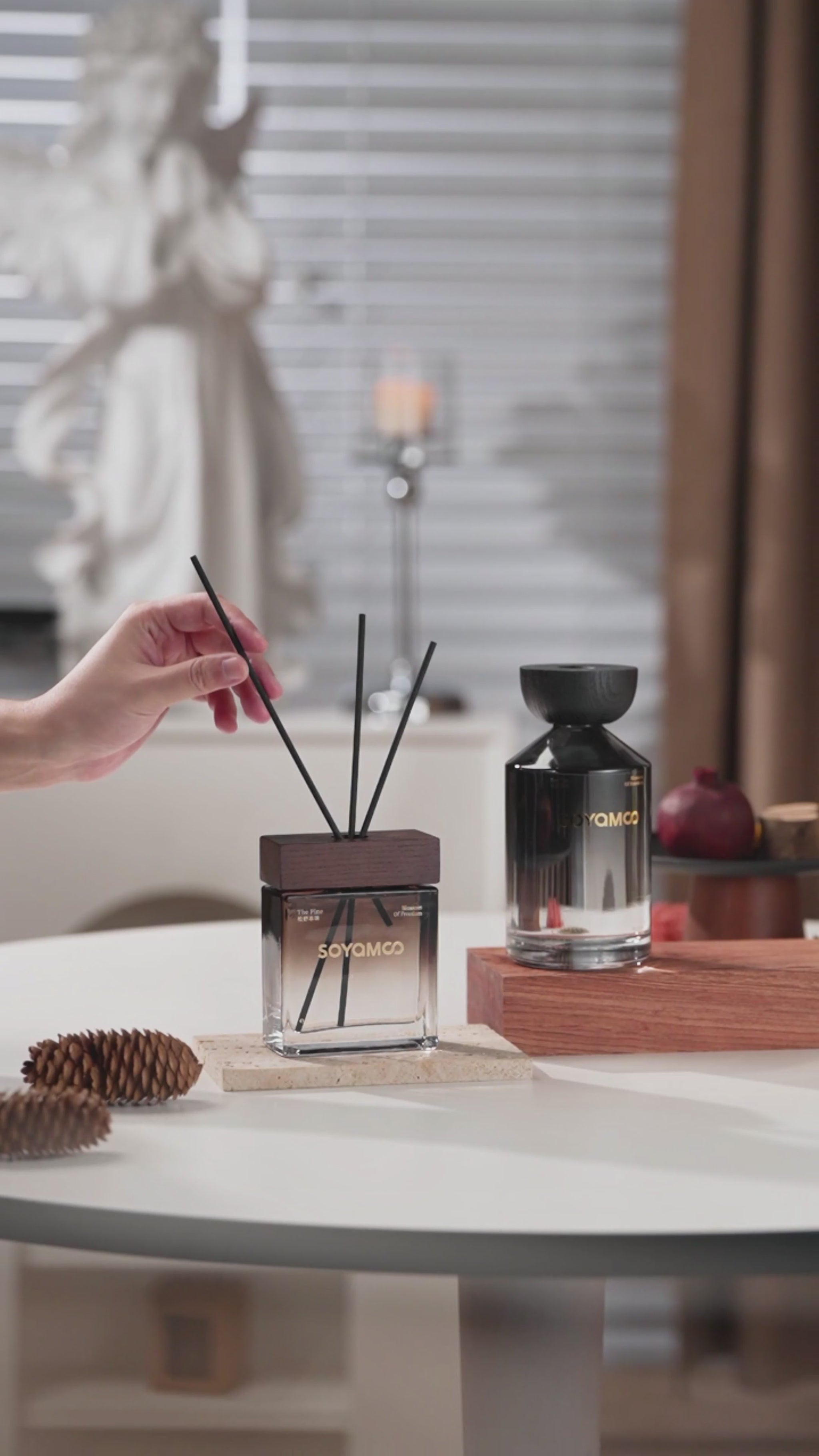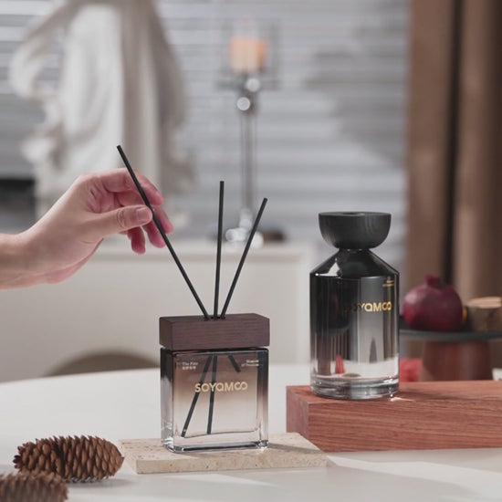 Bring a sense of calm and quiet luxury into your home with the Zen Tea Valley Wilderness Angled Shoulder Glass Reed Diffuser – 300ml, a refined blend of natural fragrance and modern design. Inspired by the vast stillness of mountain wilderness, this diffuser captures the feeling of standing in open nature - where the air is fresh, time slows down, and every breath feels grounding. The fragrance evokes a peaceful tea moment in the mountains, where soft wood notes and a hint of dewy freshness create a serene and meditative atmosphere. The uniquely designed angled shoulder glass bottle features a smooth black gradient finish, offering a balance of playful form and elegant simplicity. Paired with a natural wooden cap and subtle gold detailing, it elevates any interior space with a touch of understated sophistication. Fragrance Notes The scent opens with a light citrus brightness, gently transitions into a soothing blend of black tea and soft florals, and settles into a warm cedarwood base. A delicate dewy nuance lingers, creating a clean, calming fragrance that feels both natural and refined. Perfect for living rooms, bedrooms, bathrooms, or workspaces, this diffuser continuously releases a subtle aroma, transforming your surroundings into a peaceful and inviting sanctuary.